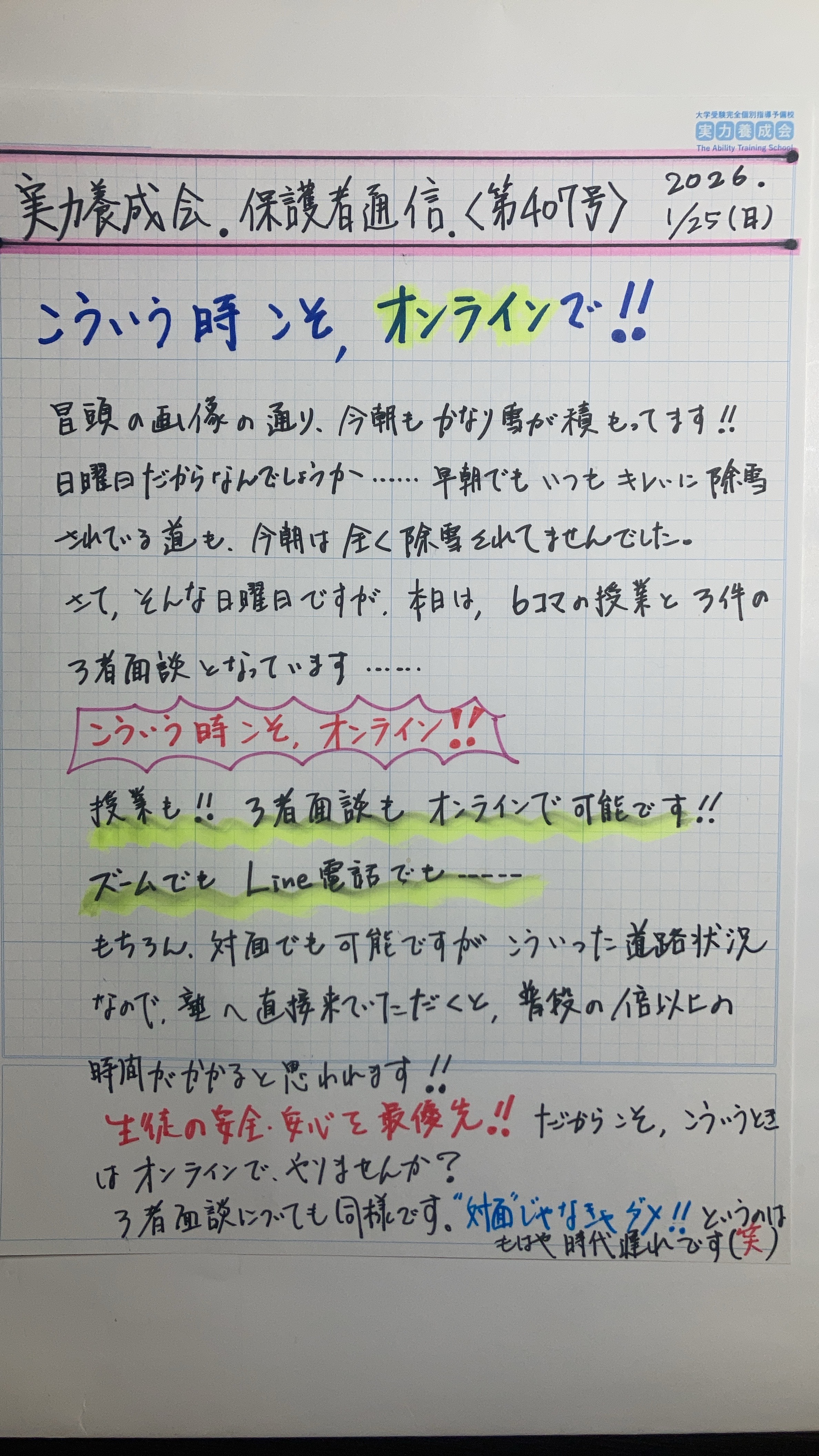 実力養成会通信 第3130号 ”オンライン授業、オンライン三者面談” の巻 - 2026/1/25