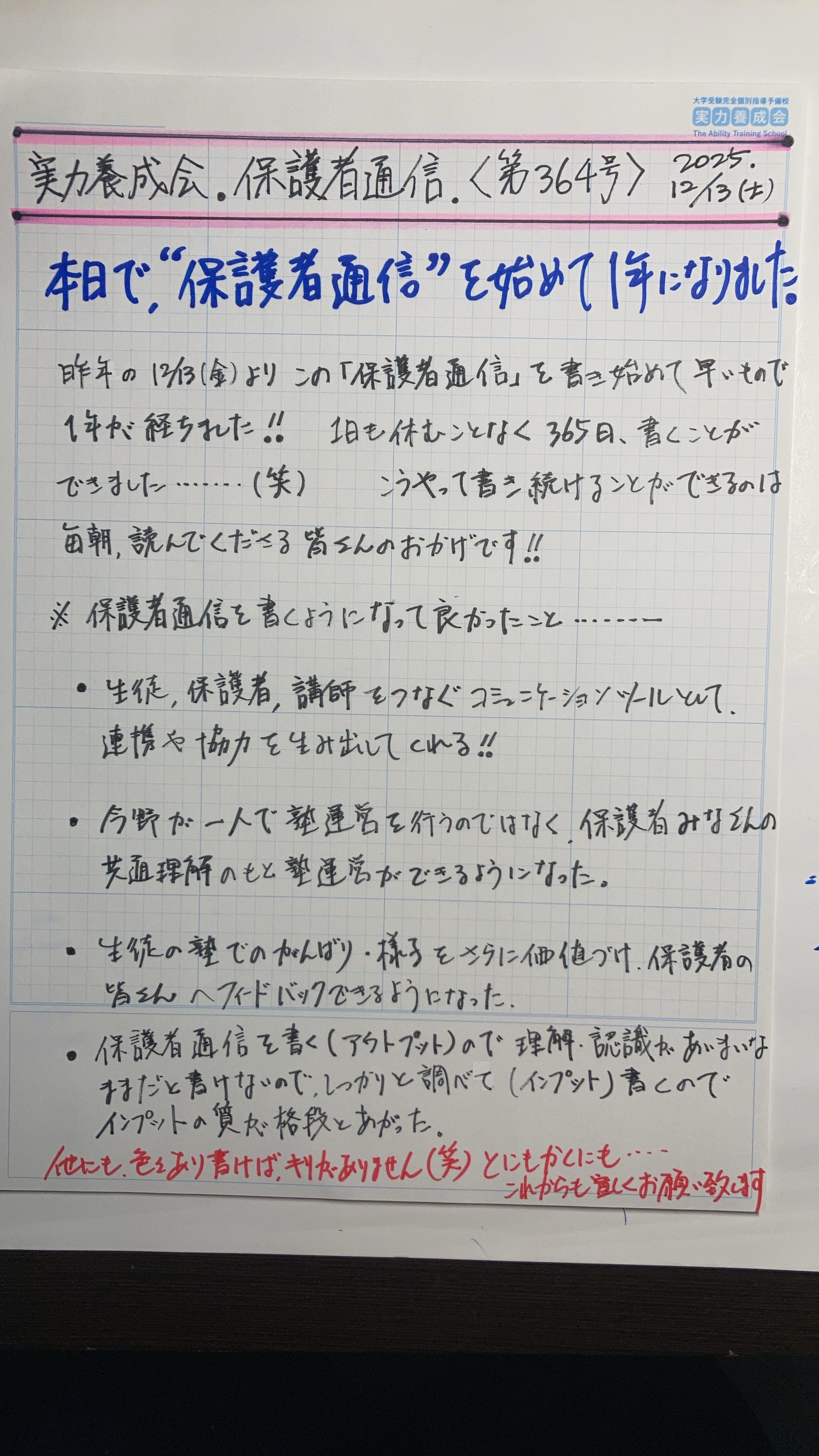 今朝の『保護者通信』で2年目に突入しました!!