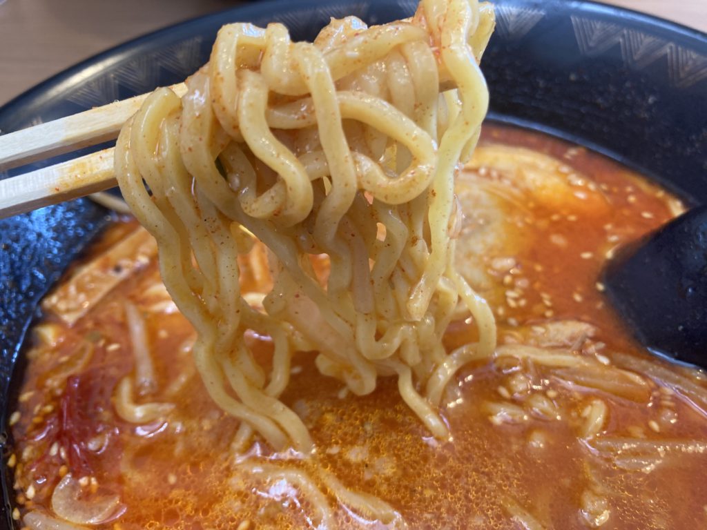 中太ちぢれ麺、のど越しがとてもいいです、そしてスープがよく絡みます。