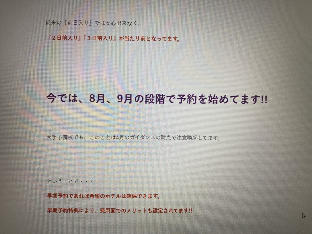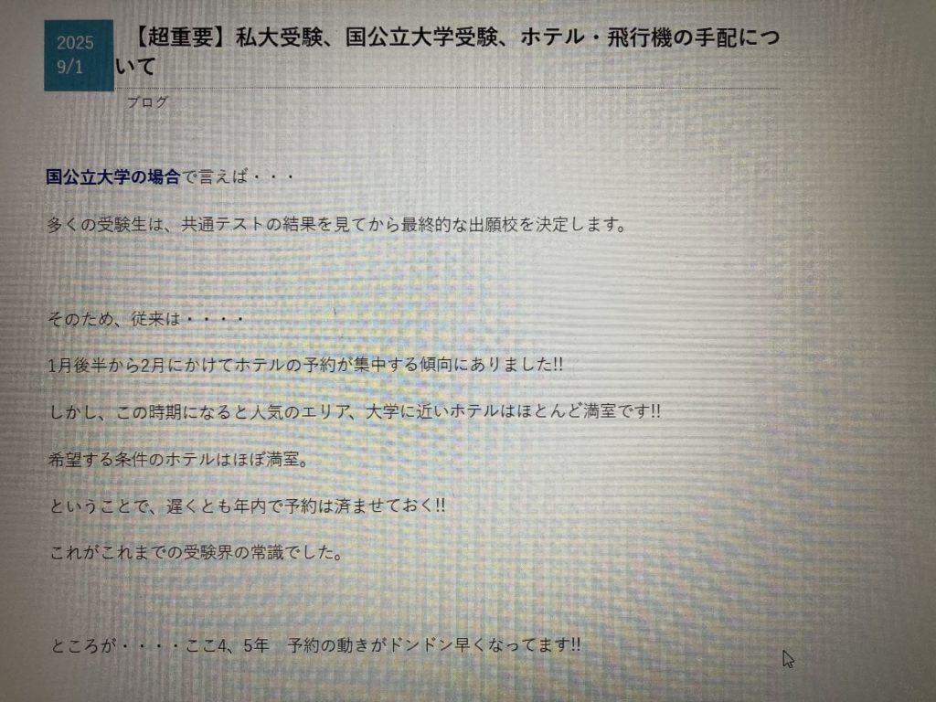 賢明な受験生、保護者の方は8月、9月の時点でホテル、飛行機の手配は済んでることと