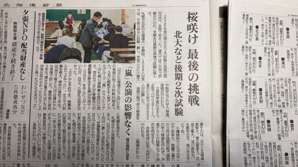 北大後期試験が無事終了しました、昨日の朝刊です。