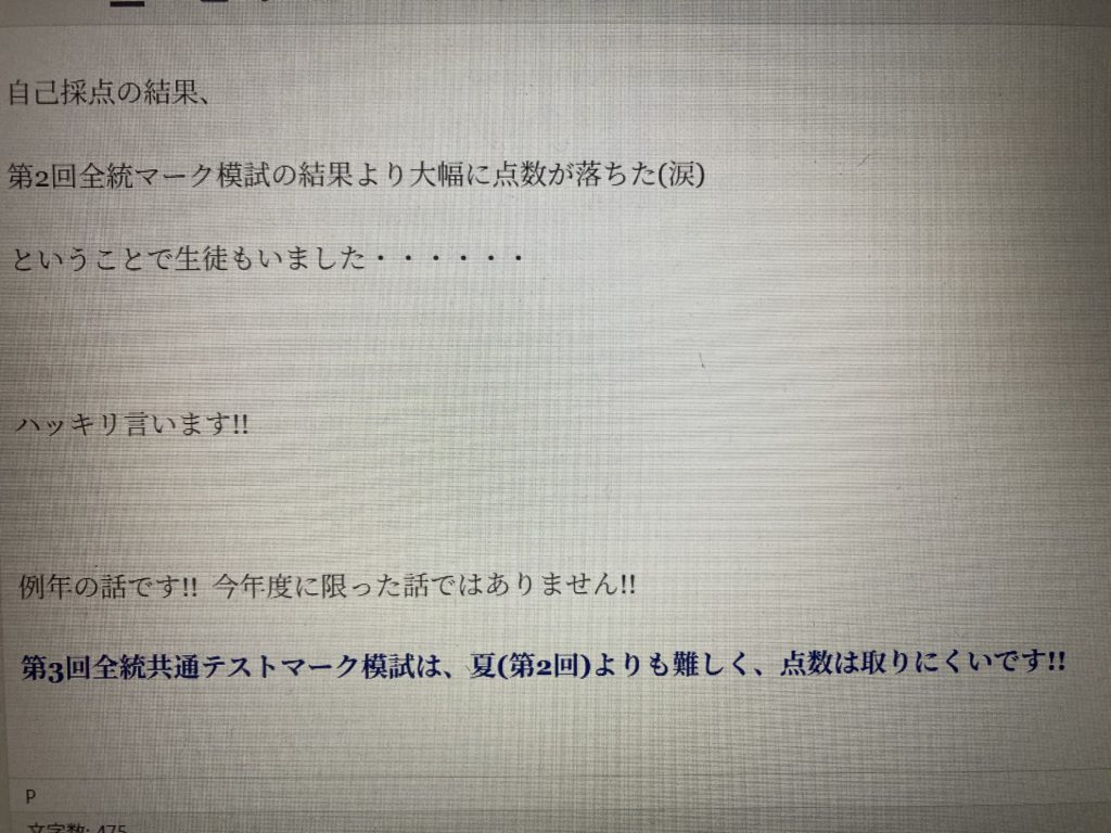 この事例からも、夏の第2回全統マーク模試より、40点~50点近く、点数は落ちている!!