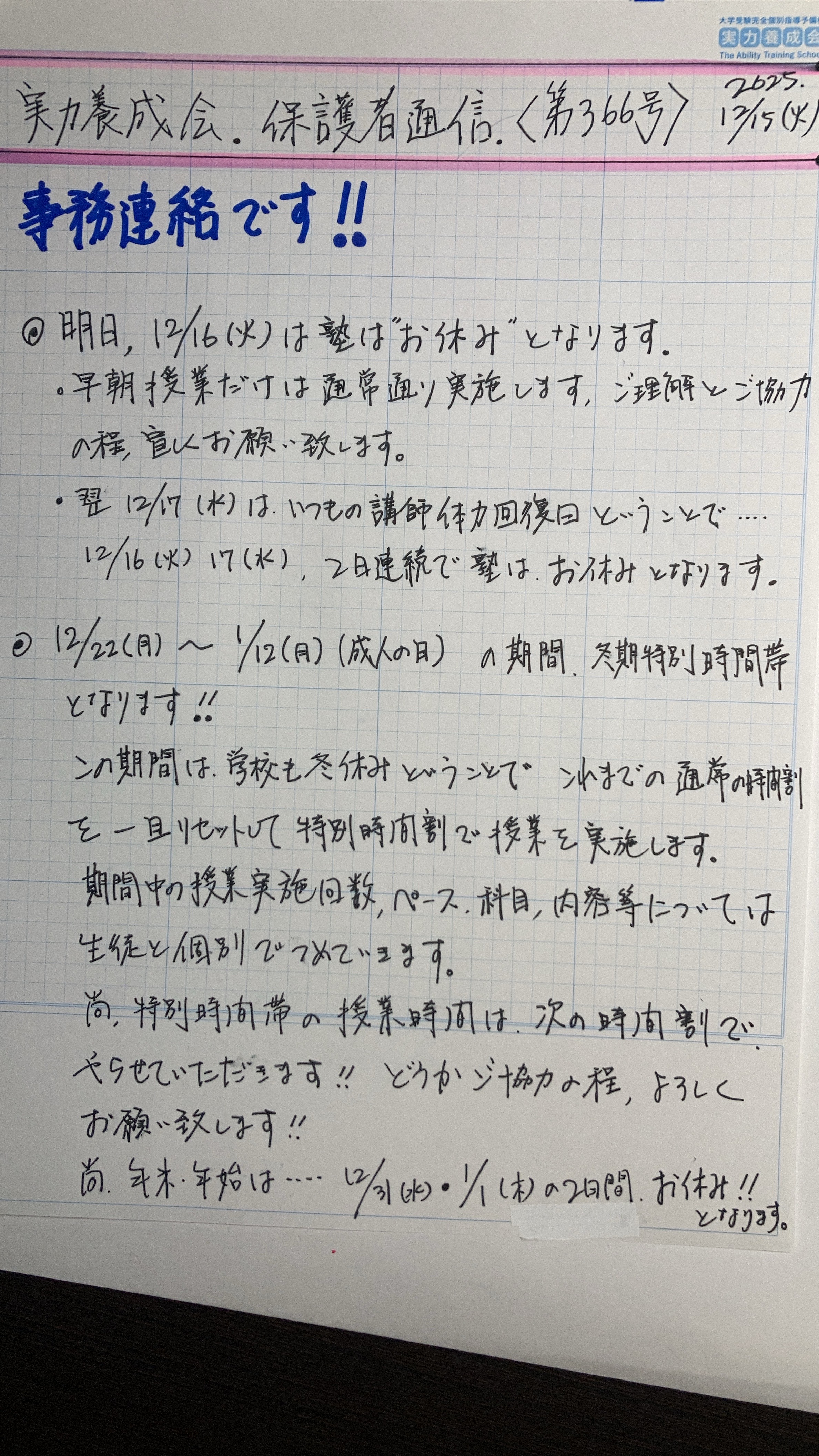実力養成会通信 第3091号 ”保護者様のご紹介によるお問い合わせ” の巻 - 2025/12/17