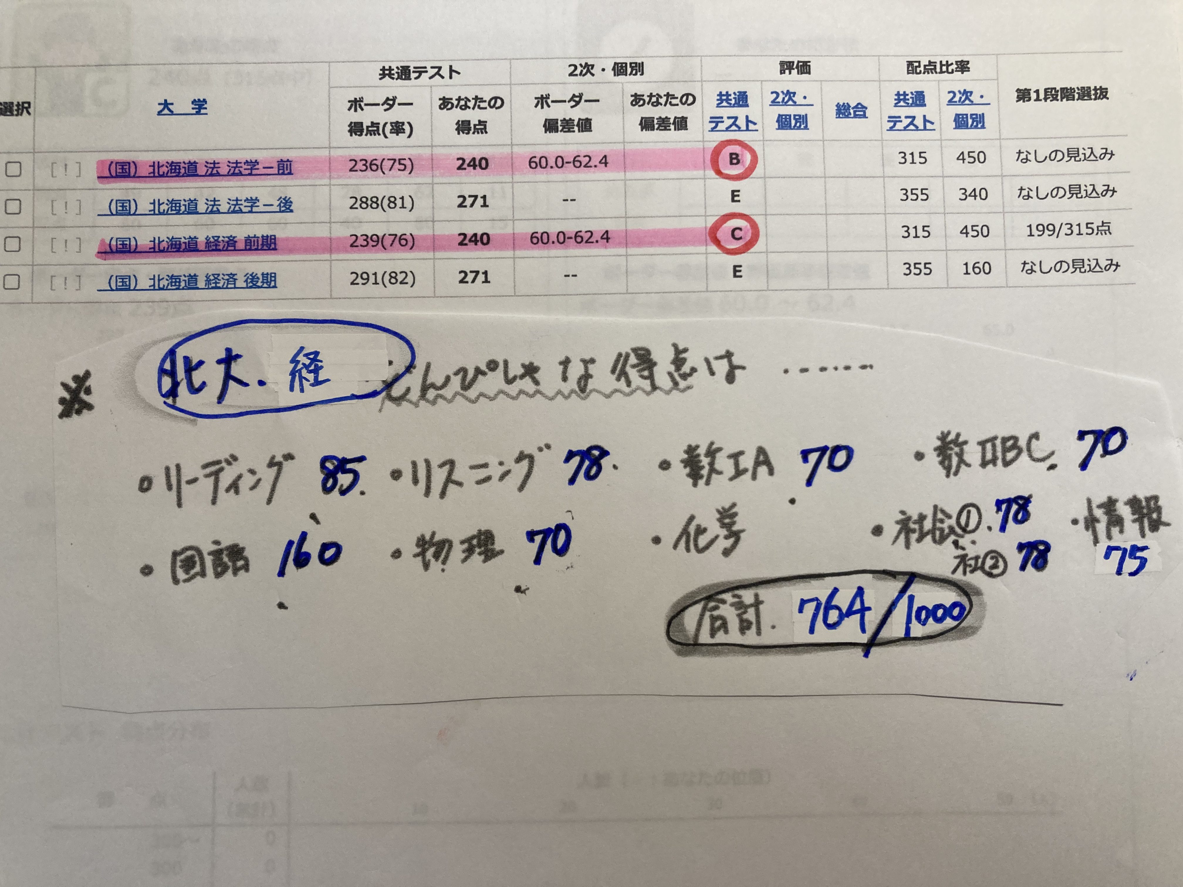 これが今年の共テ『北大経済B判定』ドンピシャな点数です。