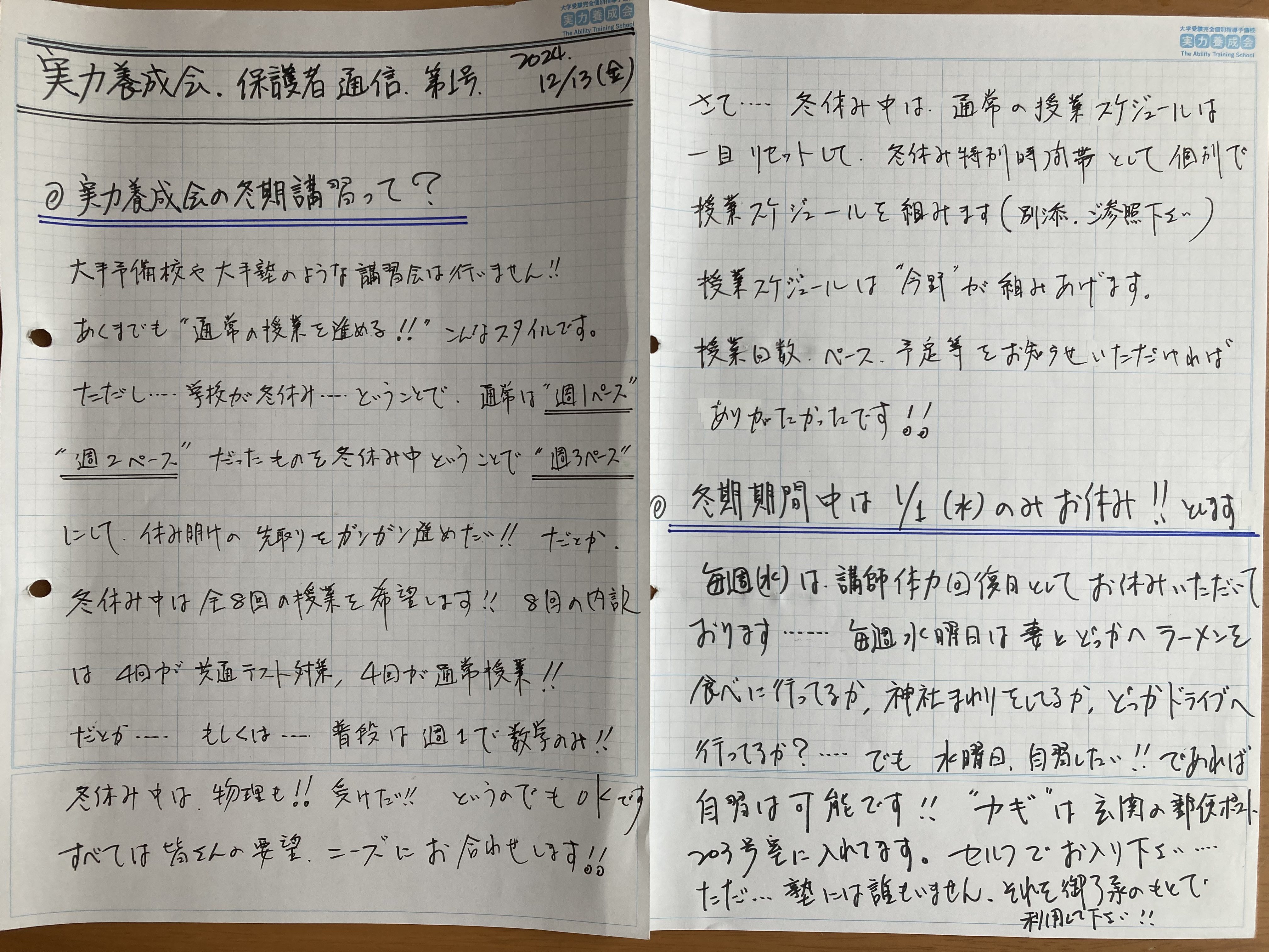 “実力養成会通信” や ”ブログ” では書けないような『リアル』を保護者の皆さんへ伝